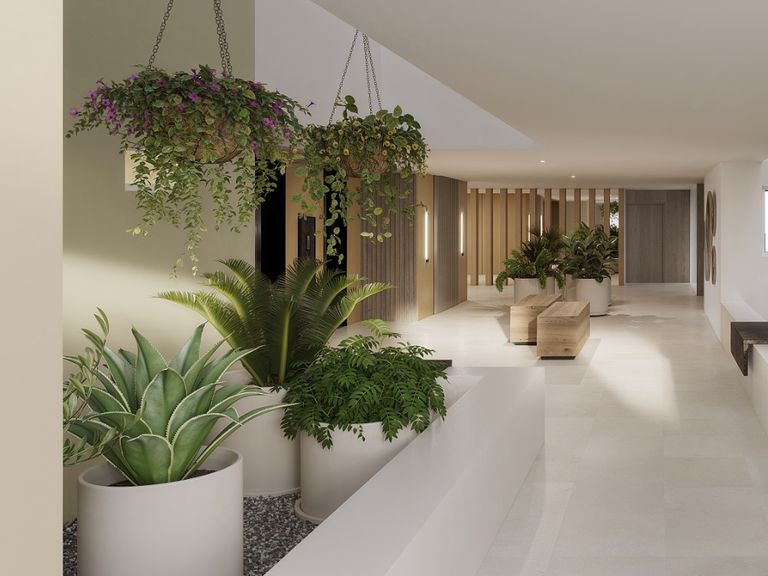 Through the thoughtful integration of warm wood paneling, mirrors that create an infinite visual depth, and lush greenery that breathes life into the space, we crafted a refined yet effortless ambiance. Subtle seating areas invite residents to pause and connect, resulting in hallways that feel not just like transitions, but serene extensions of the home itself.