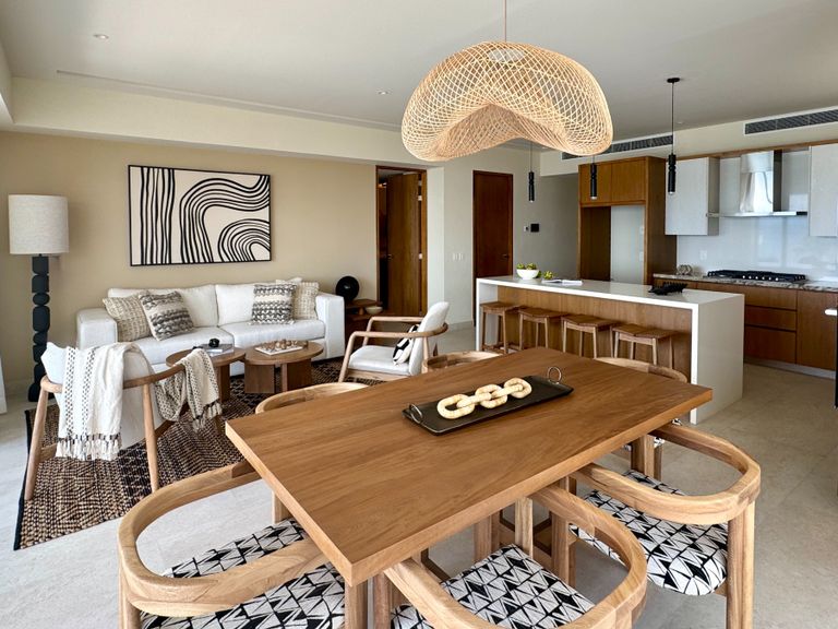 Designed for long-term living in a tropical paradise, this apartment embraces the essence of its surroundings. Every detail is inspired by the jungle that envelops the property, creating a serene connection between indoor comfort and the natural world outside. The use of organic materials, such as clay, pays homage to the cultural roots of the region, while natural textures and earthy tones evoke a sense of harmony and timelessness. The result is a warm, authentic retreat that feels both deeply rooted and effortlessly elevated.